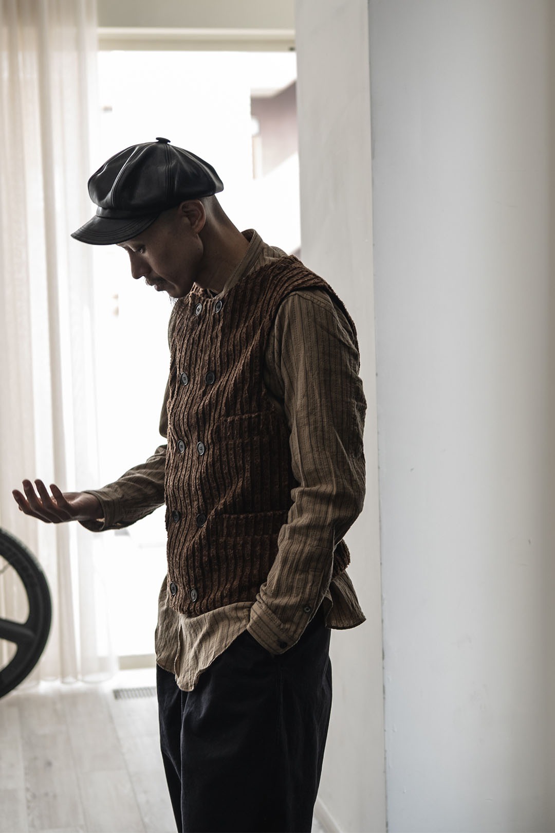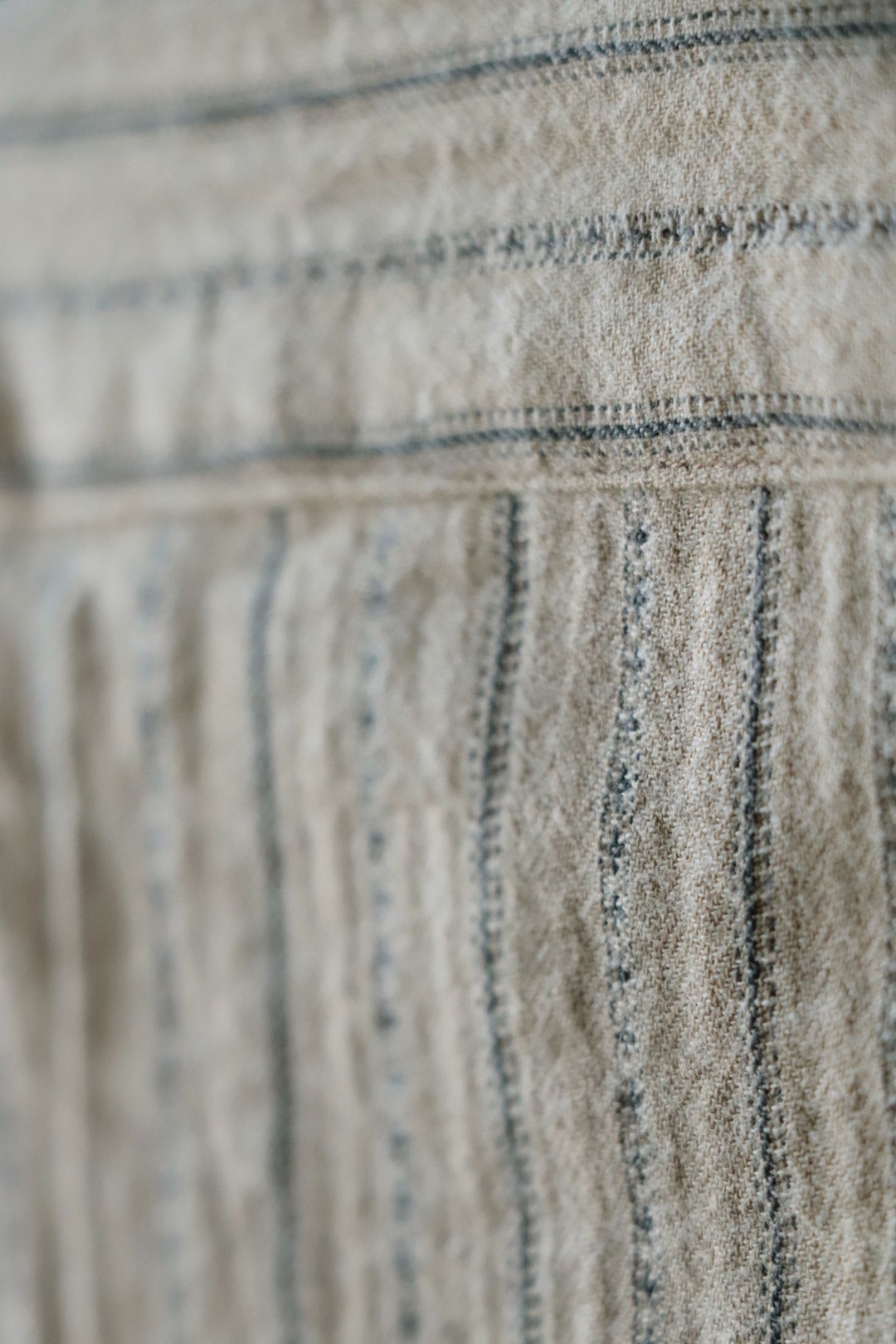 とても滑らかで柔らかな生地感と、軽量でリラックスできる着用感が特徴のコットン素材。凹凸感のあるシャーリング素材に起毛を施すことにより、軽くて温かみのある素材に仕上がっております。その生地感もさることながら、クラシカルなストライプ柄や起毛した表情、色合いも魅力的です。
