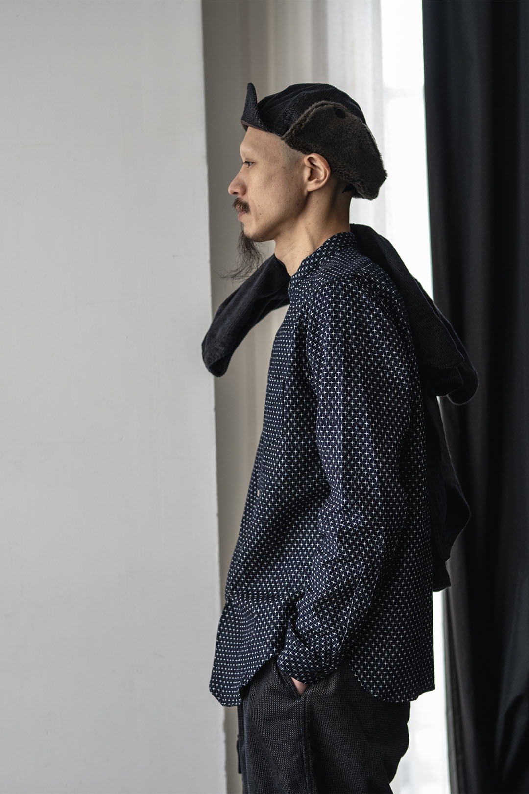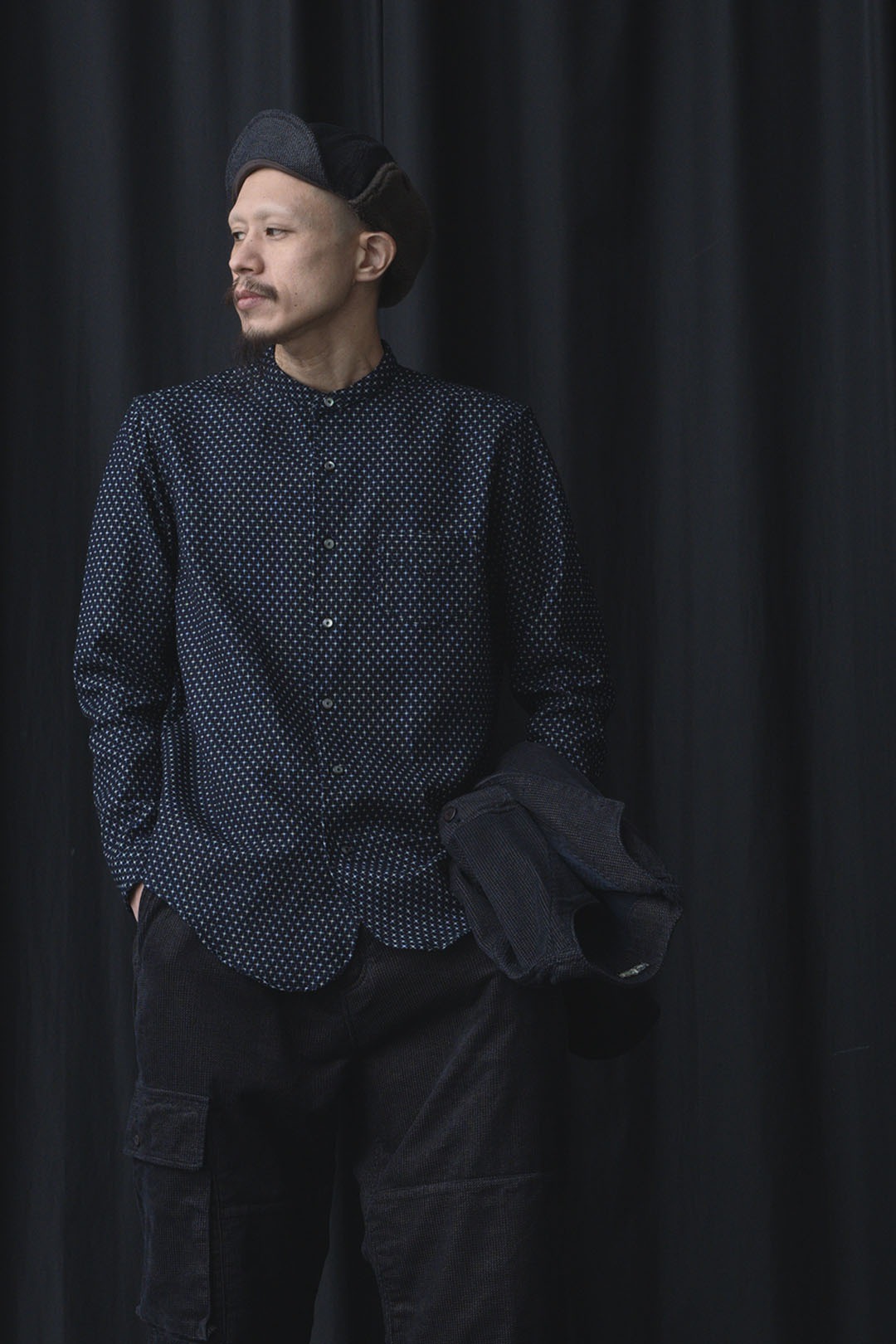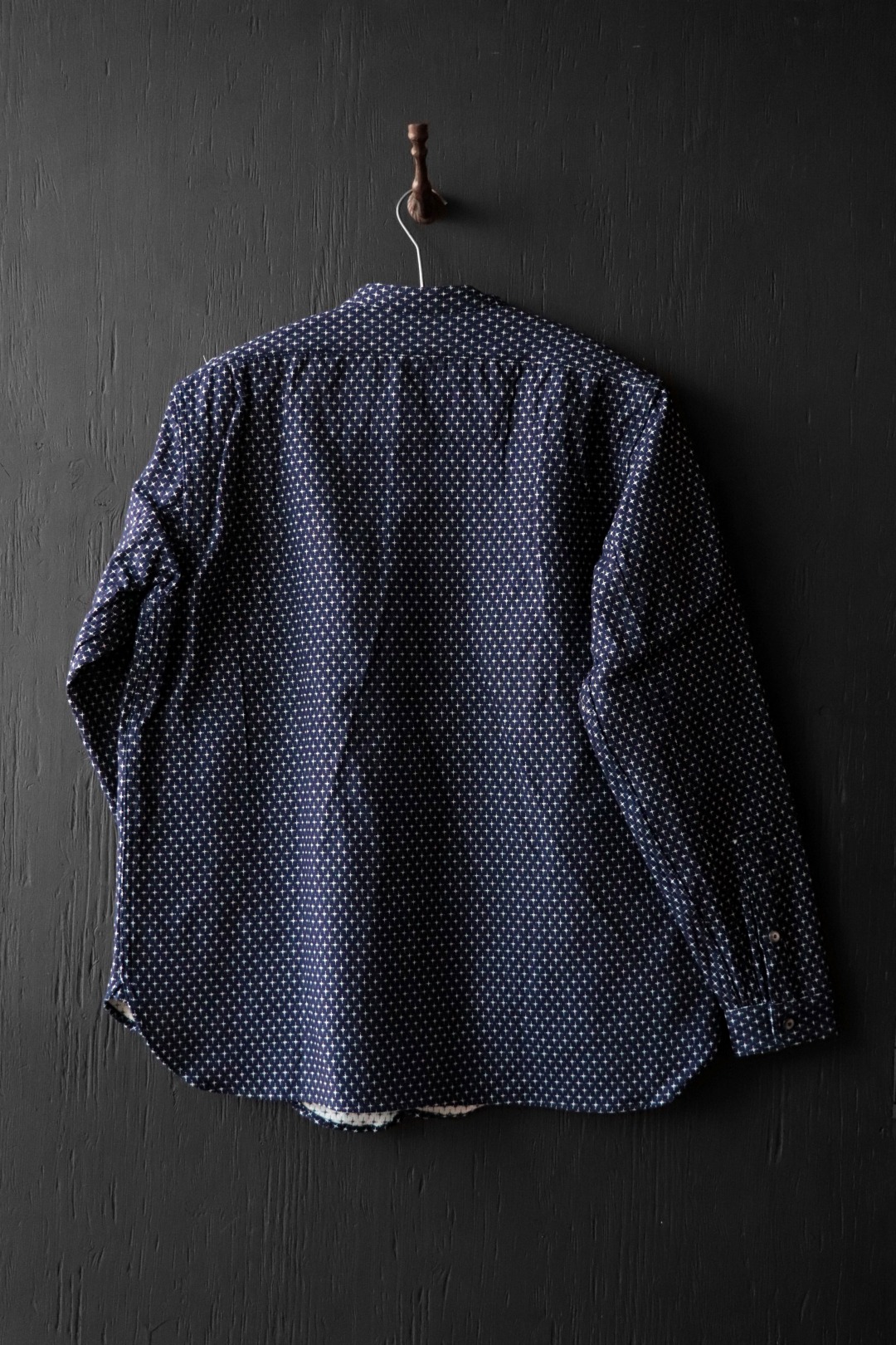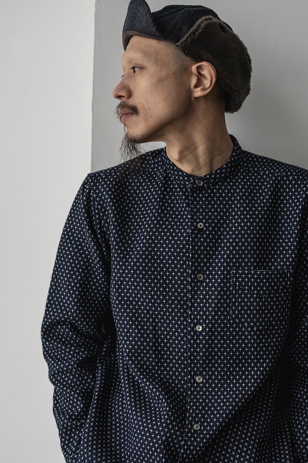 Jacquard Cross Band Collar Immigrant Shirt / Dark Indigo