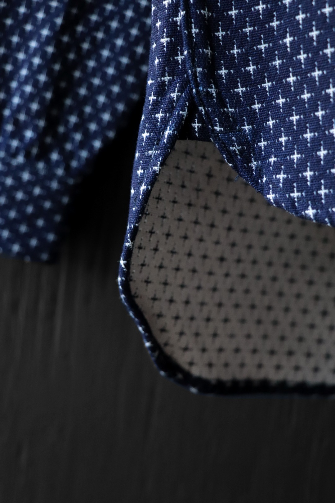 情趣のある十字柄が目を惹くコットン・ジャガード。インディゴ二重織ジャガードにて十字柄を表現しています。適度な肉感は幅広い季節に着用可能。四季の移り変わりとともに、柔らかな生地感は風合いを増し、インディゴ染料の色落ちと十字柄のコントラストが趣のある表情へと変化していくことでしょう。
