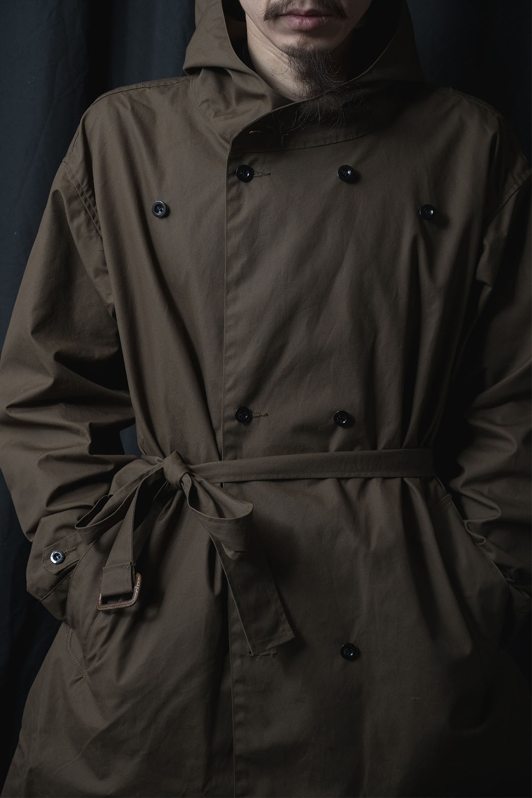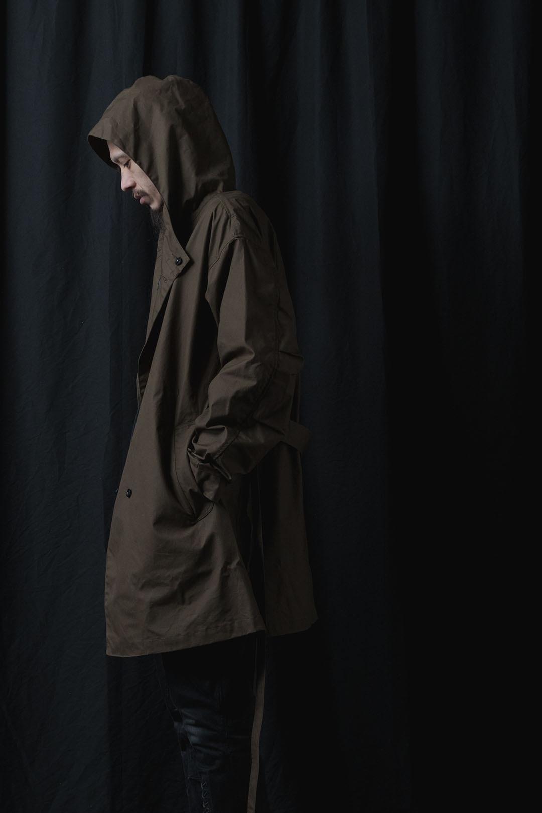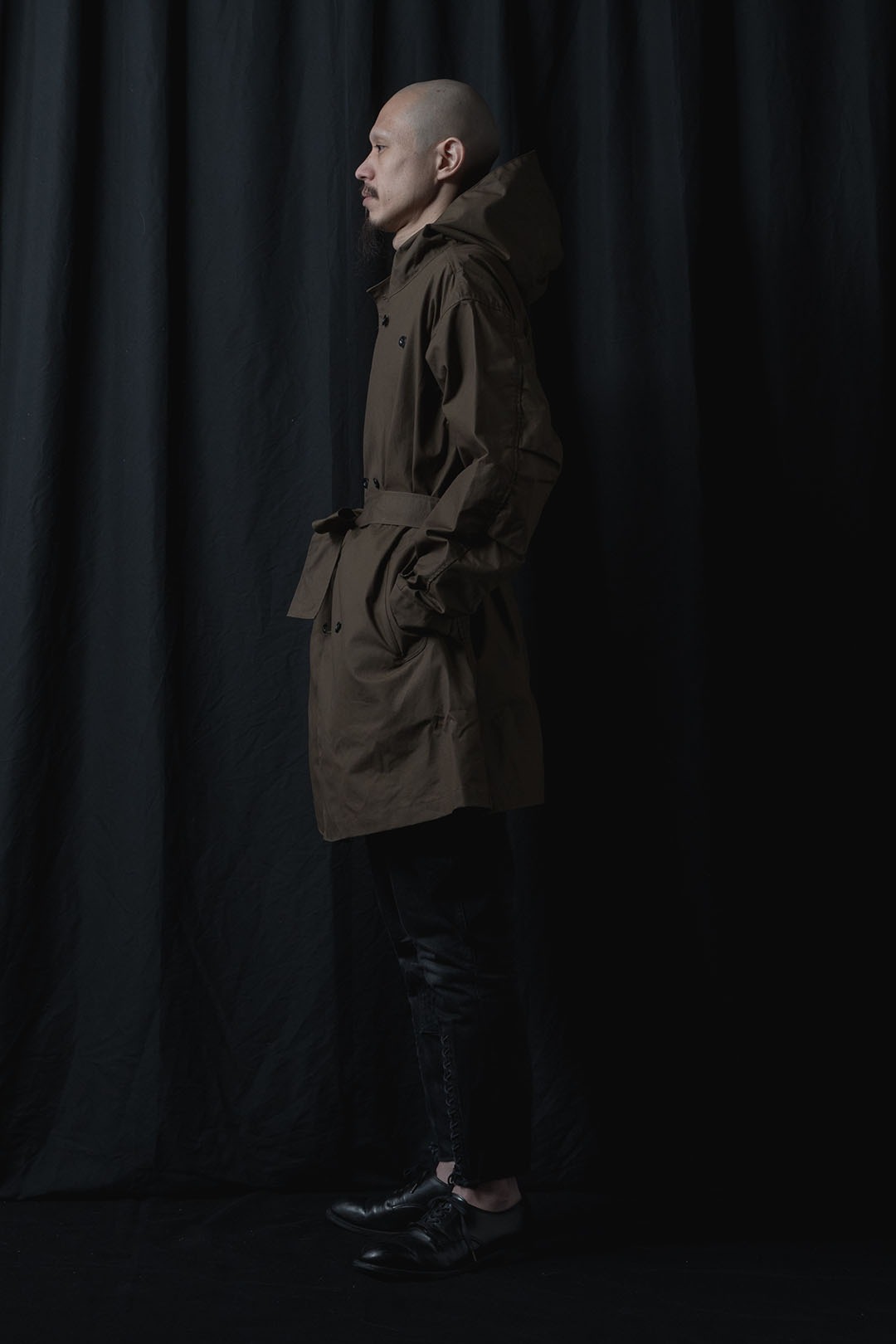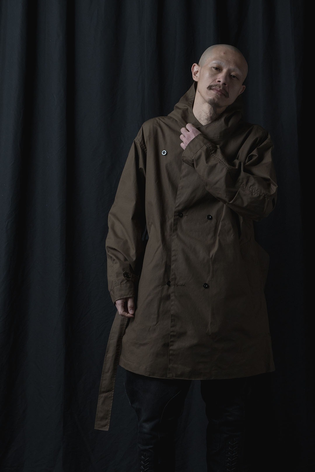 ダブルブレストのフロントに、首から上を覆う高い襟とフードなどアウターとしての機能性も十分。