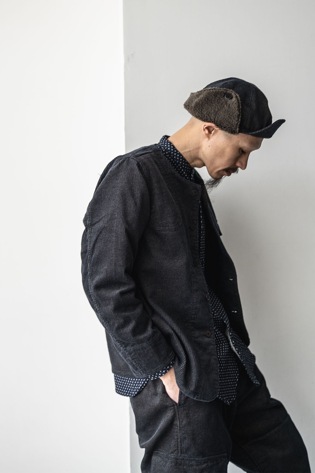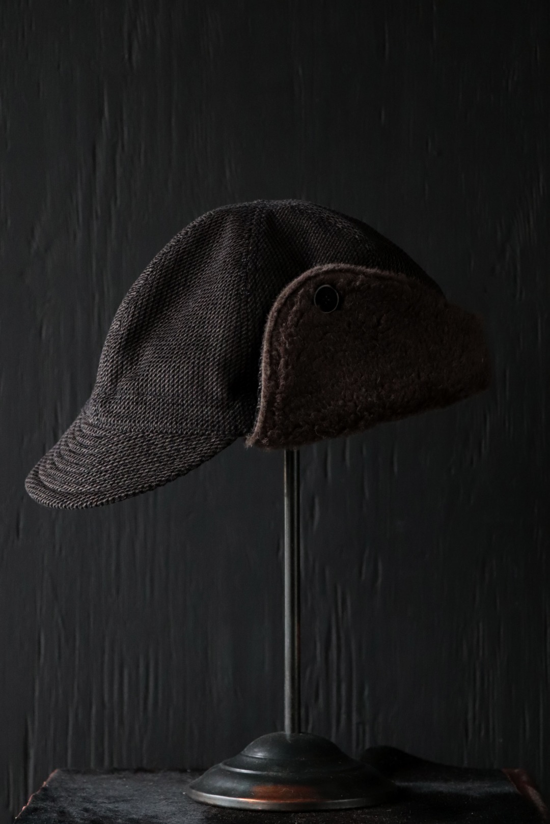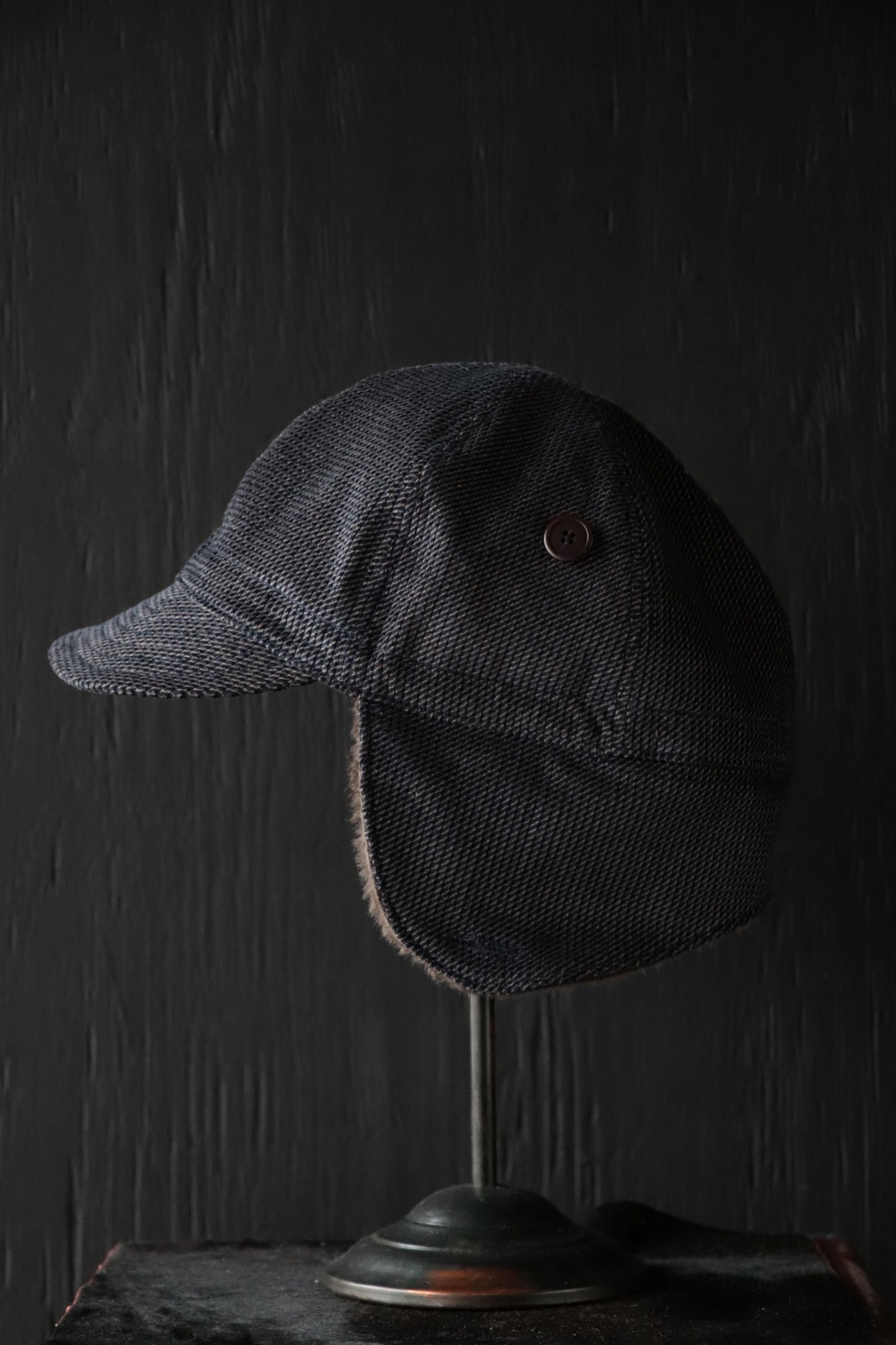 最大の特徴は、贅沢にベビーアルパカのボアを使用したイヤーマフ型の耳当て。跳ね上げた状態はボタン留めとし、収まりが良いシルエットにて着用が可能です。