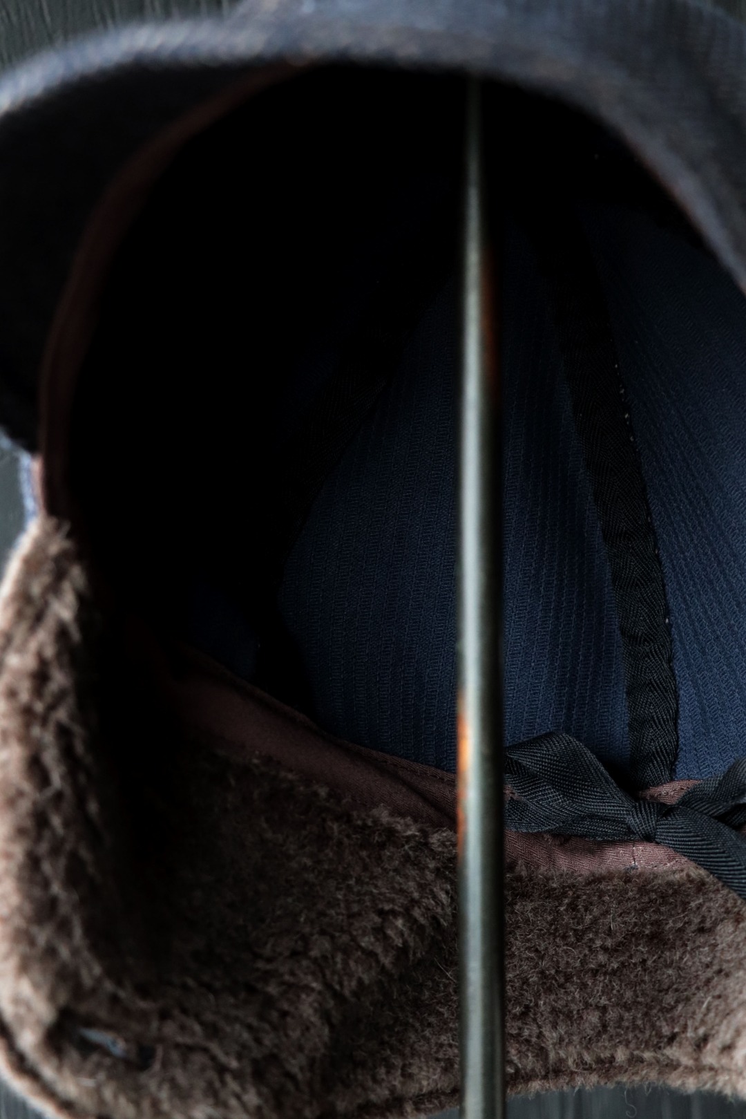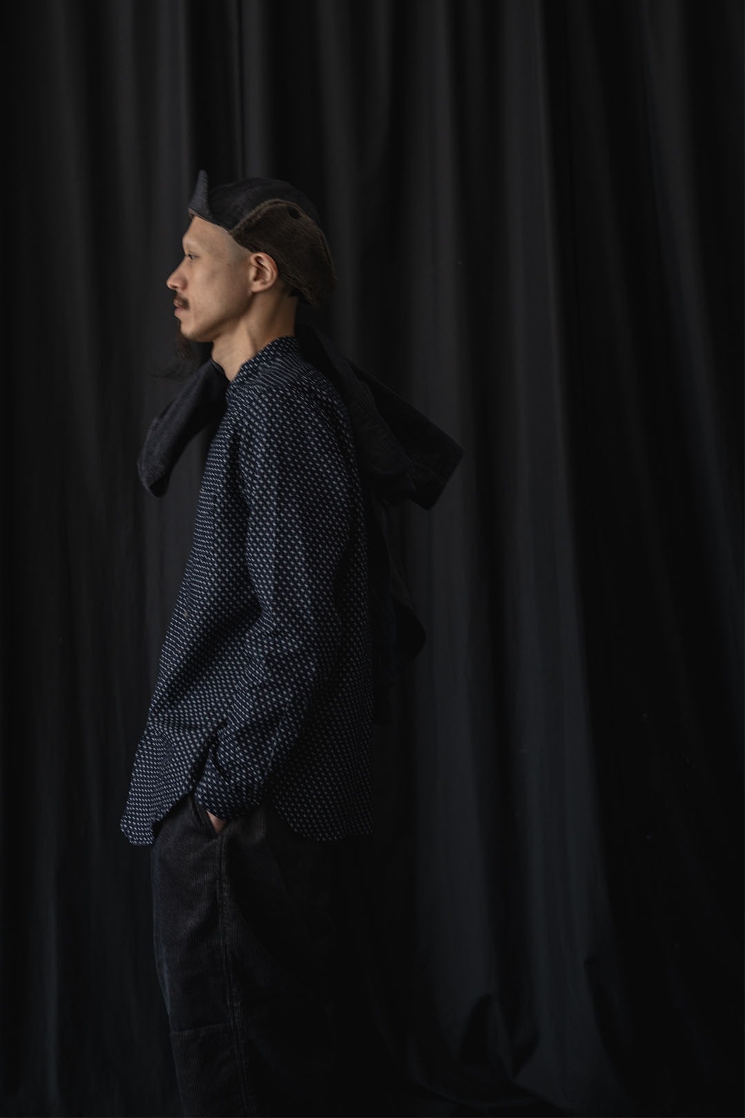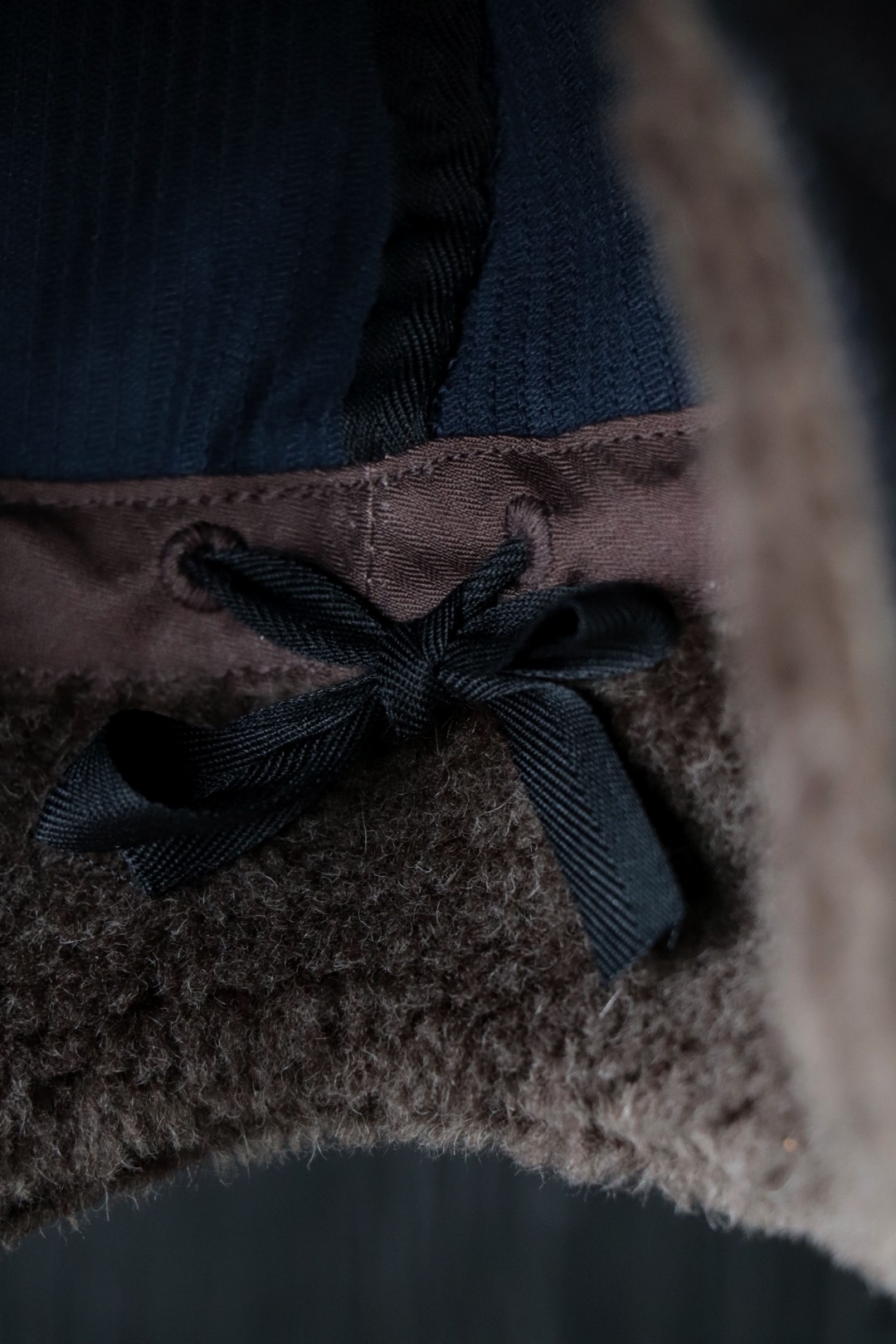 最大の特徴は、贅沢にベビーアルパカのボアを使用したイヤーマフ型の耳当て。跳ね上げた状態はボタン留めとし、収まりが良いシルエットにて着用が可能です。