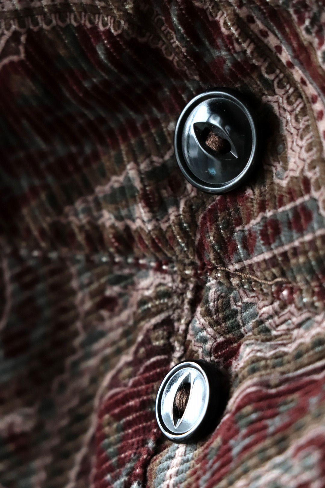 バイヤスに畝をカッティングしたコーデュロイ素材。目を惹く多色で複雑なペイズリー柄が存在感のある仕上がりです。コットンとポリエステルを染め分ける事により、深みのある色や、雰囲気を表現しています。秋冬素材として安心感と温かみのある生地感も品質の良さを感じる仕上がりです。