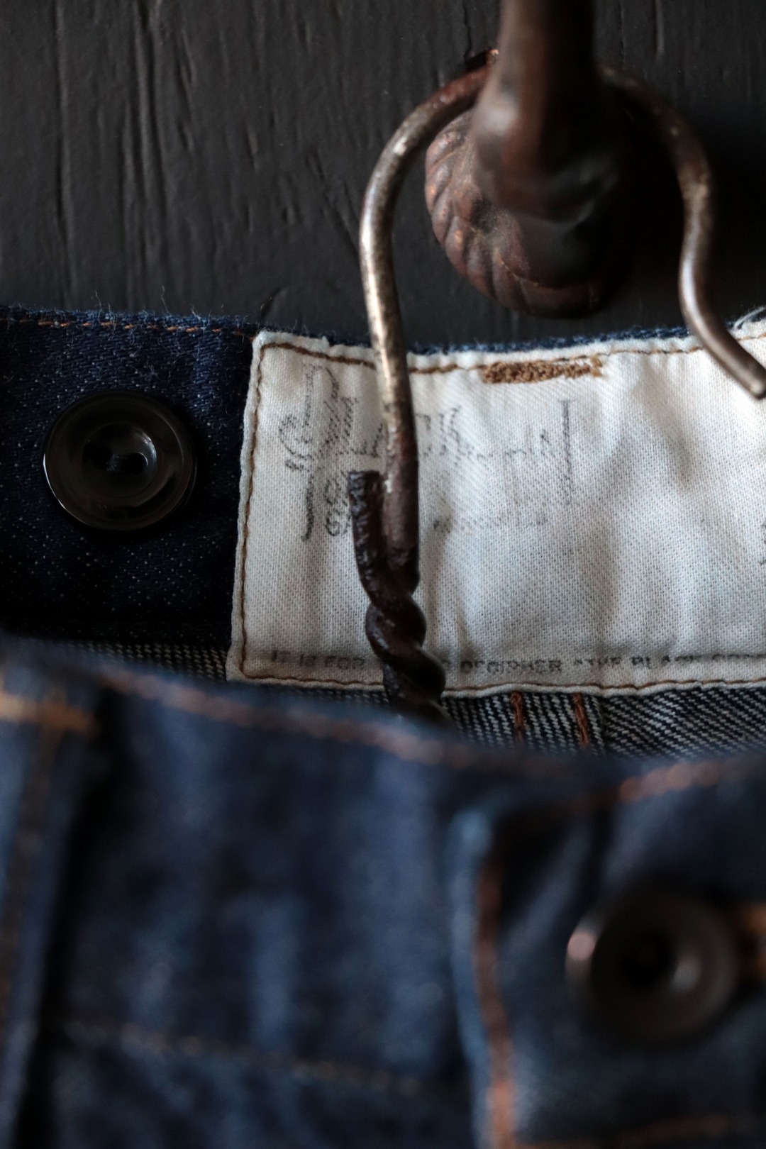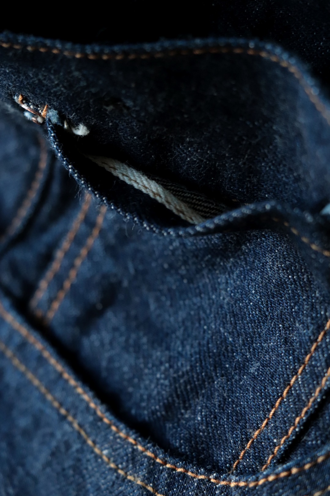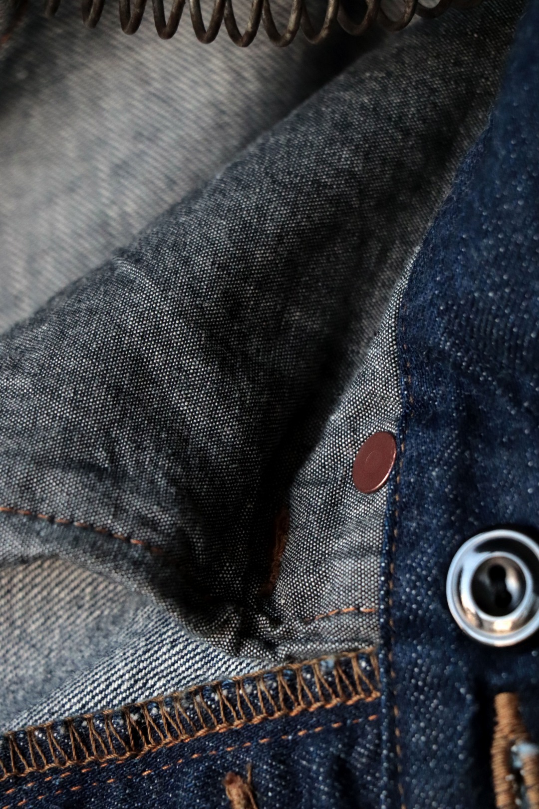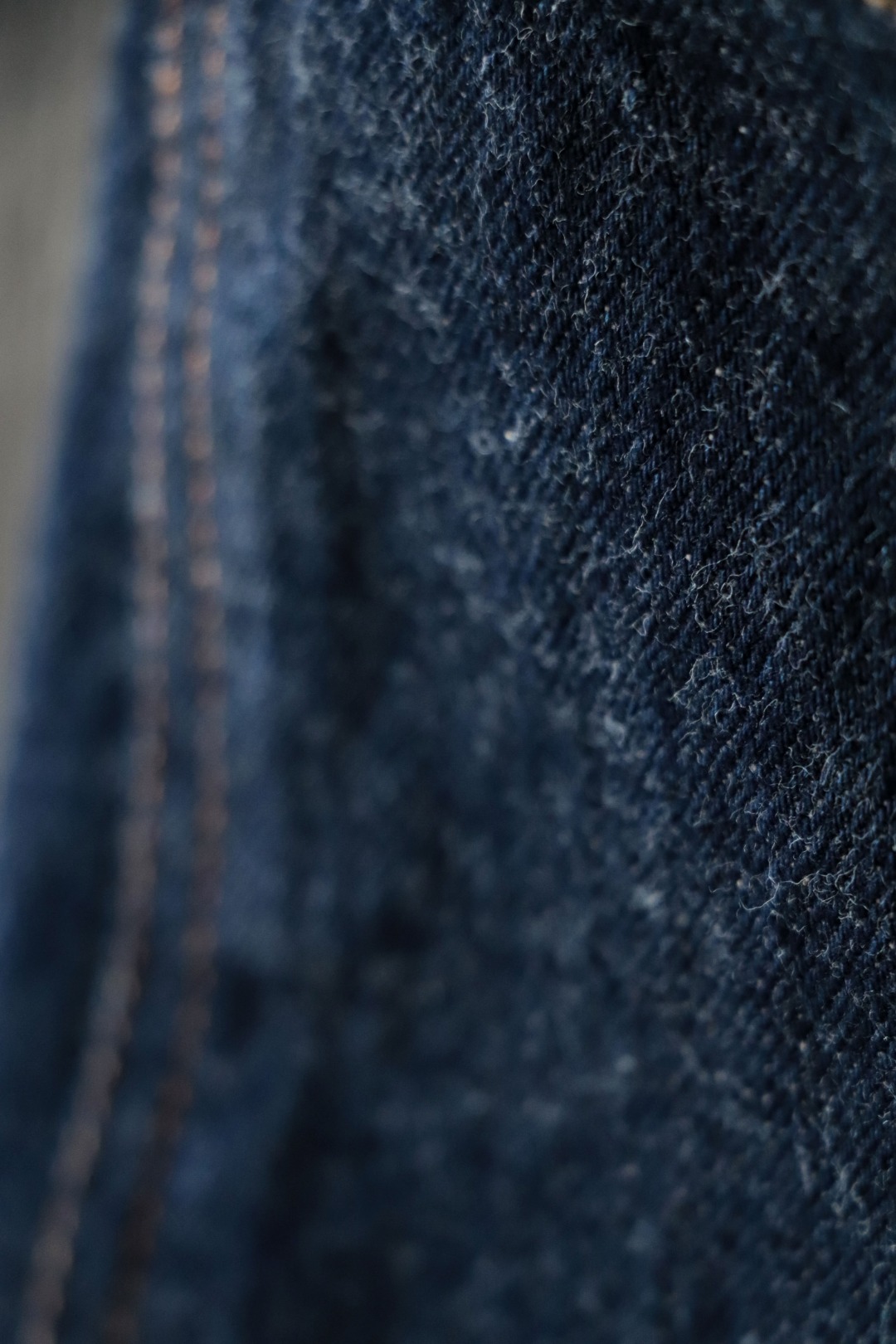 生地の特徴 / 大江洋服店が監修し、所有する当時の生地見本や文献を元に、1900年頃の天然藍から合成インディゴに切り替わった最初期のインディゴ・カラーを再現したデニム。ムラの形状はヴィンテージ・サンプルを徹底的に研究し具現化しました。織の規格は1890年から1930年代の第2次世界大戦前の規格を用いており、当時9oz Blue Denimと呼ばれていた規格に基付いています。現在のヤード計算に換算すると12.5オンスになり、当時は今と違いオンスの計算方式をライナーヤードで計算しておりました。