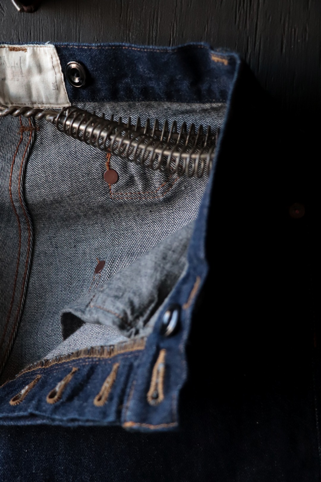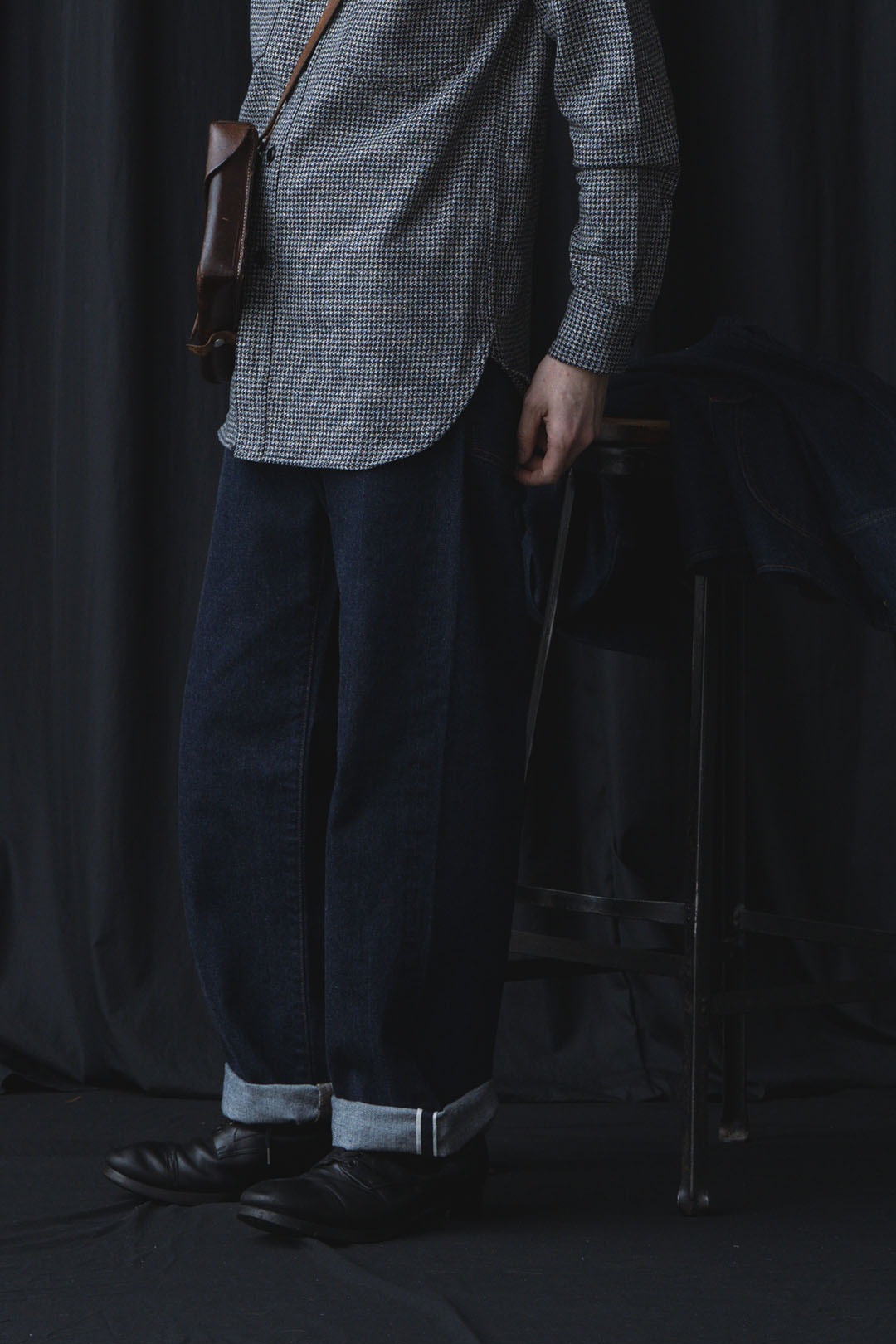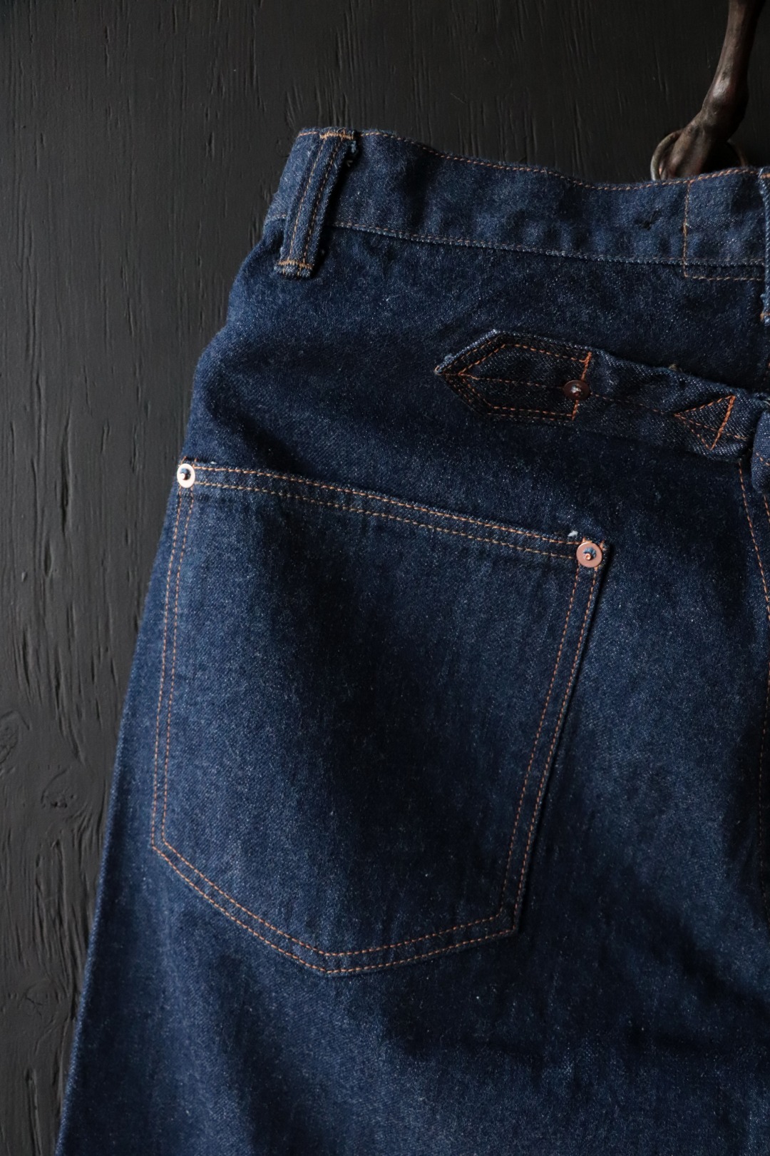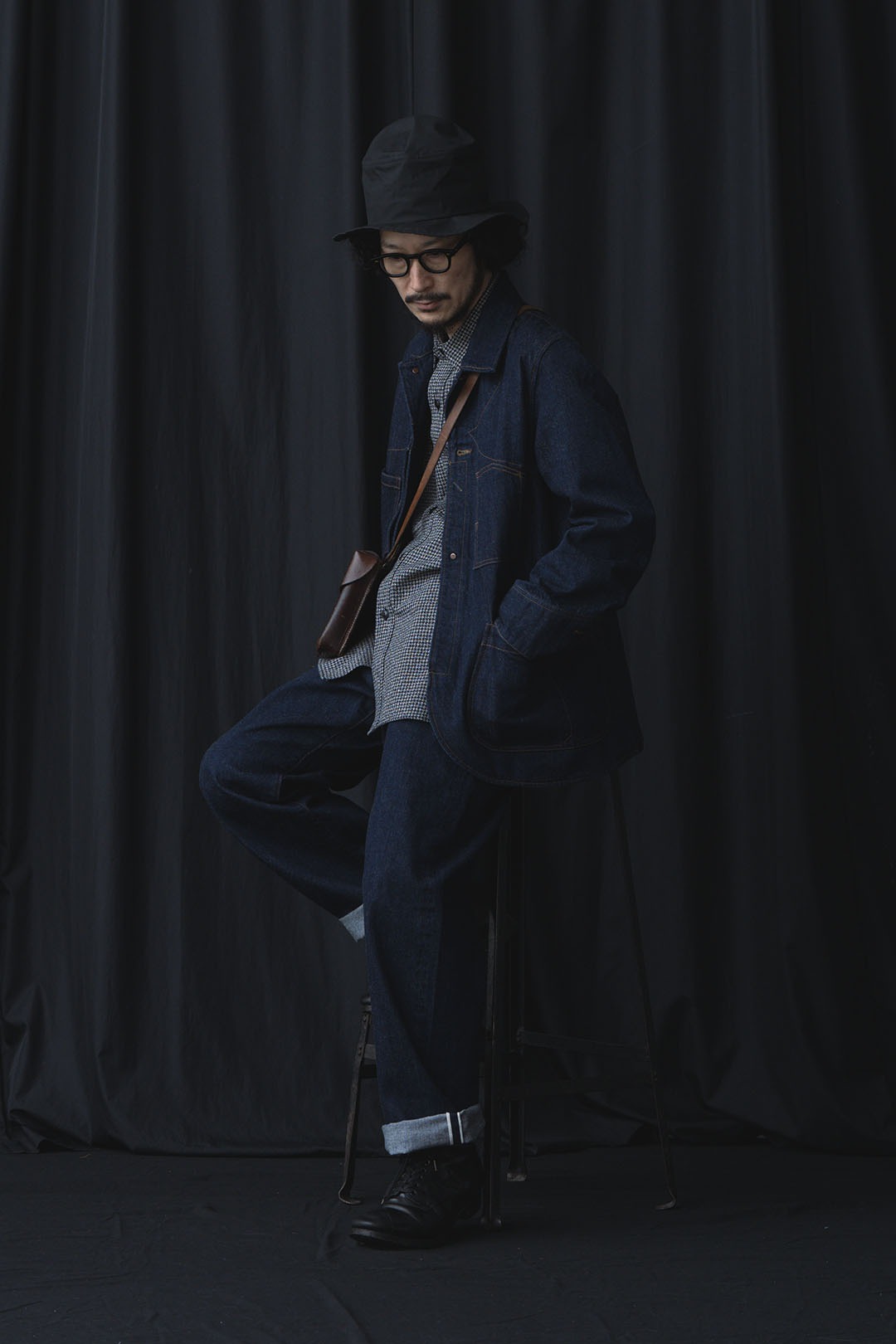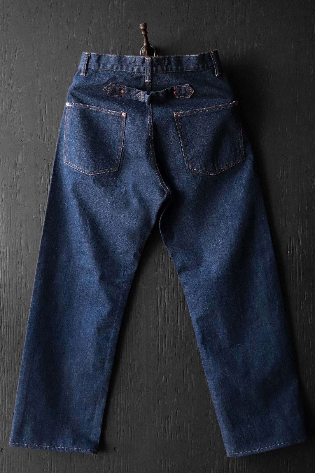 生地の特徴 / 大江洋服店が監修し、所有する当時の生地見本や文献を元に、1900年頃の天然藍から合成インディゴに切り替わった最初期のインディゴ・カラーを再現したデニム。ムラの形状はヴィンテージ・サンプルを徹底的に研究し具現化しました。織の規格は1890年から1930年代の第2次世界大戦前の規格を用いており、当時9oz Blue Denimと呼ばれていた規格に基付いています。現在のヤード計算に換算すると12.5オンスになり、当時は今と違いオンスの計算方式をライナーヤードで計算しておりました。